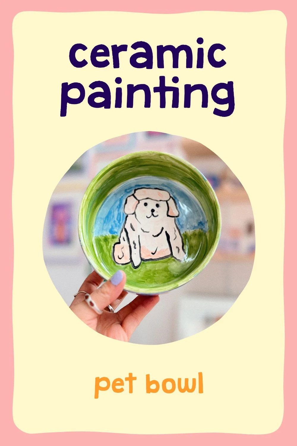 paint your own bowl, treat jar, or pet memento in this adorable furry friend themed workshop! add special details like their name, a funny portrait, or some of their favourite things!