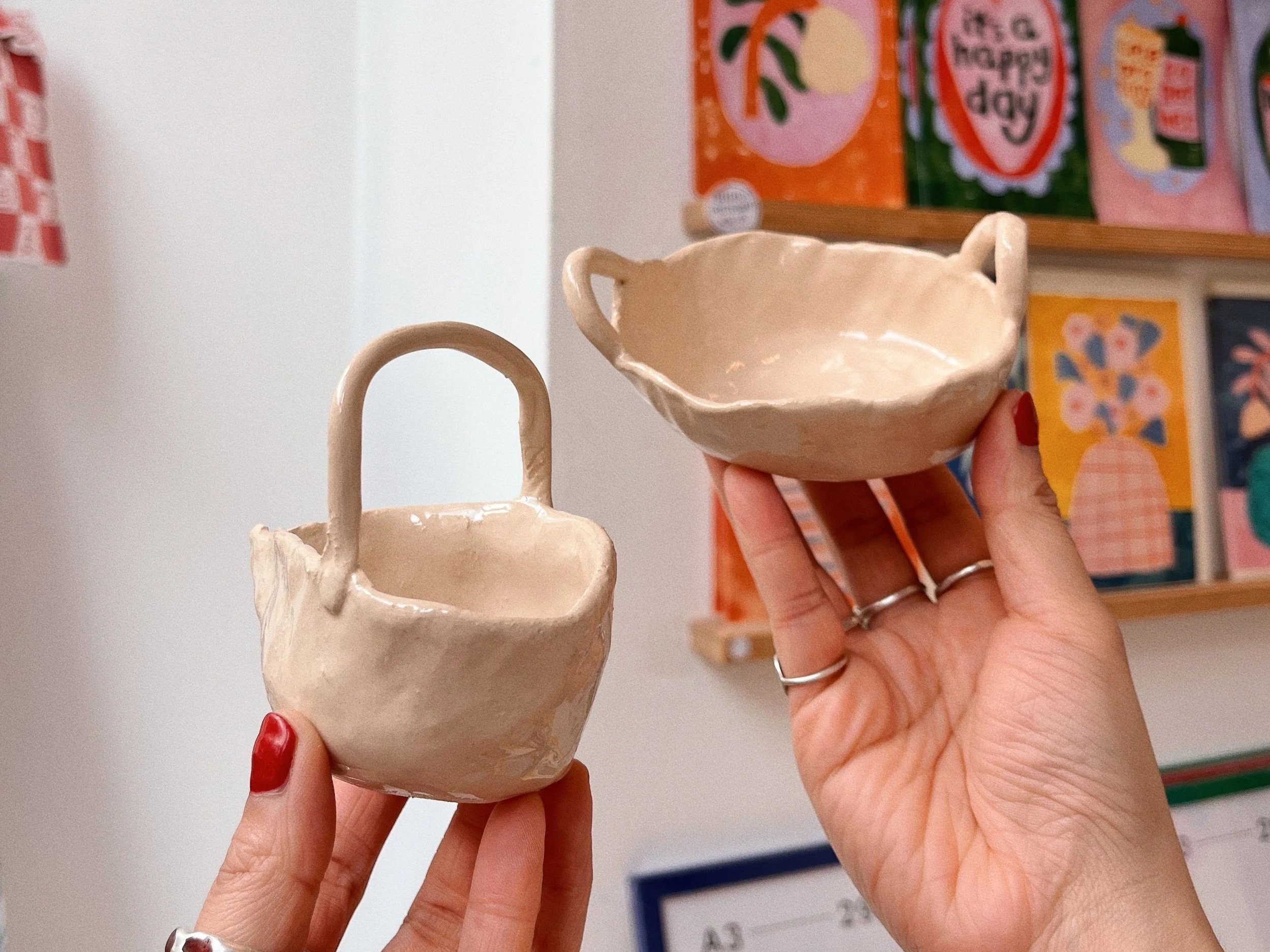 After the session, your creations will be fired in the kiln and glazed in a clear finish, which means the result will be a beautiful off-white, beige colour with a high-gloss shiny finish that is food-safe, water-tight, and dishwasher safe.